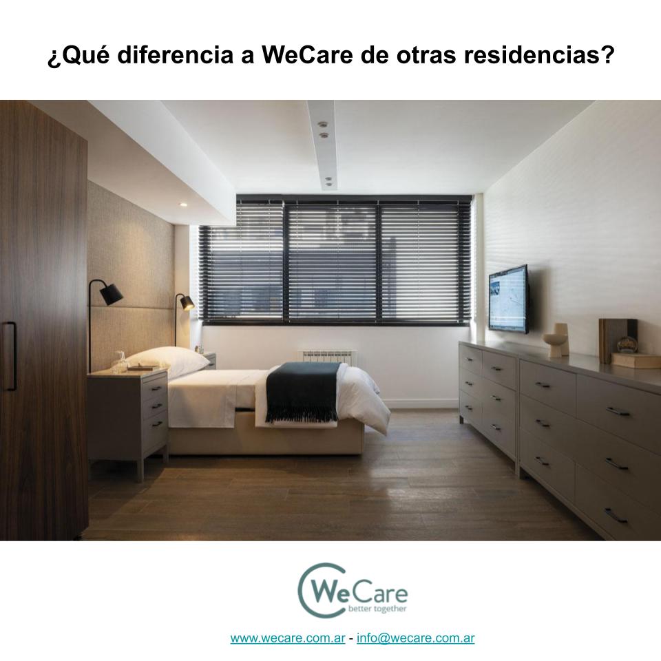 Si hay algo que diferencia a We Care de la competencia es nuestro servicio completo. La calidad edilicia que brindamos va más allá de nuestros espacios, o la tecnología de punta en el gimnasio, en las habitaciones, en el baño o en la cocina, sino que existe en todo nuestro equipo y cada uno de nuestros profesionales. We Care se coloca a total disposición de los residentes y sus familias, y trabajamos para convertirnos en un tipo de residencia que no existía antes en Argentina.